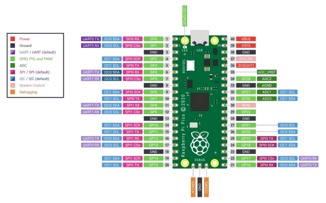 Raspberry Pi Pico 2Wのピン配置は下記のようになっています。